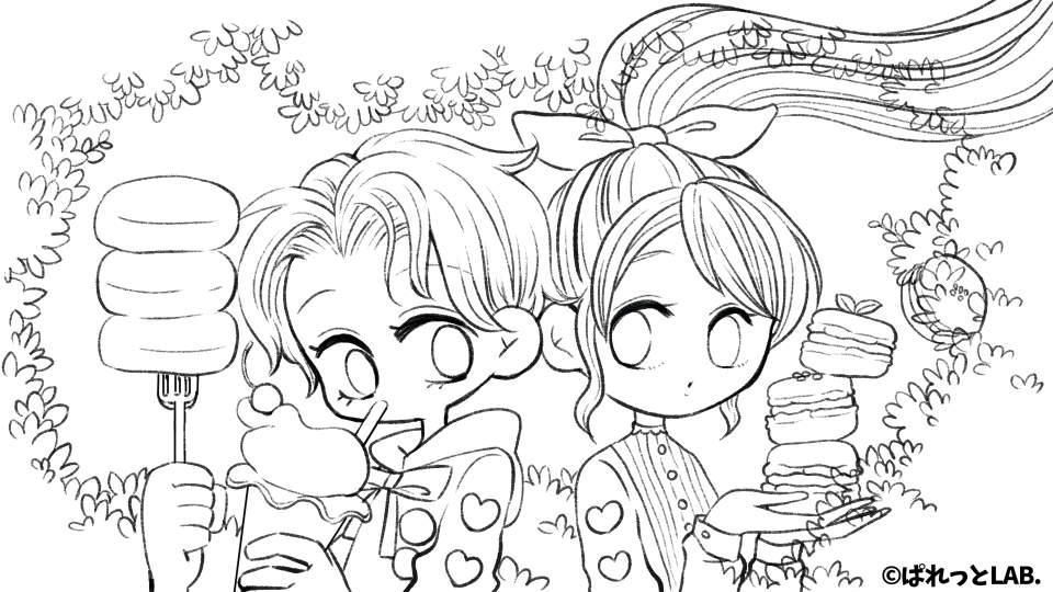 別レイヤーでレイヤーモードをオーバーレイにして色味をざざ~っと入れるのも好きでよくしてます(髪の上やマカロン持ってる手の所など)
