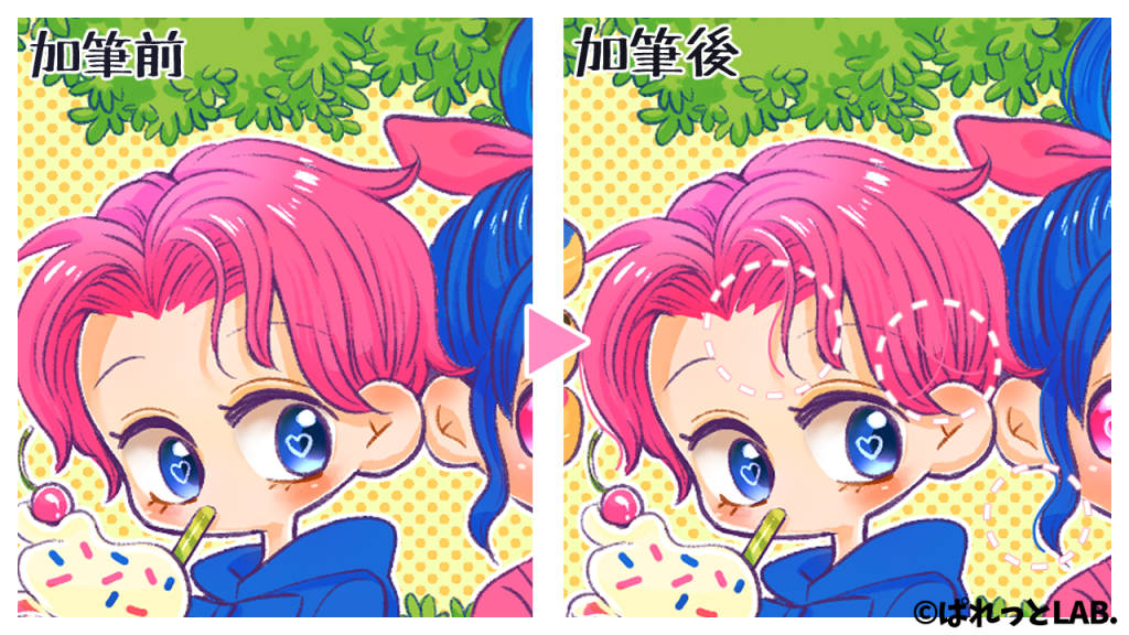 実は普段あまり加筆しないのですが(笑)髪の毛やまつ毛など顔周りに入れるとカワイイ気がします。