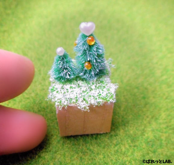 短く切って木の葉っぽくなるように切り整えて、絵の具で雪が降り積もったように加工しました。