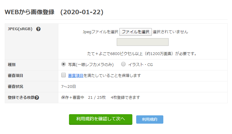 写真投稿と共通のため、イラスト素材に当てはまらない項目もあるのですが、チェックを入れればあとは「画像を登録」をクリックすれば登録できます。