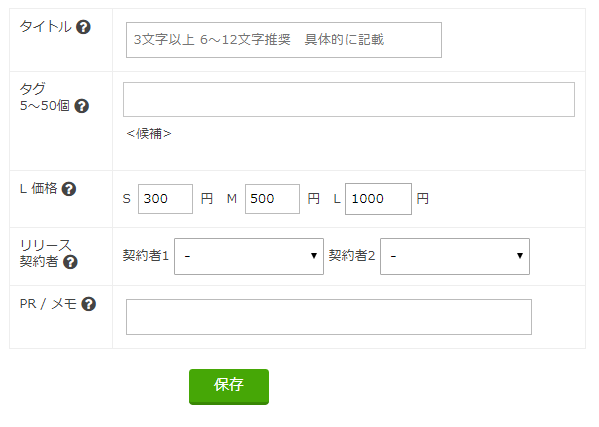 - リリース契約者 ・・・ 写真などの画像の場合はリリース・モデルなどの提示が必要です。イラストの場合は特に関係のない事項なので空欄で。