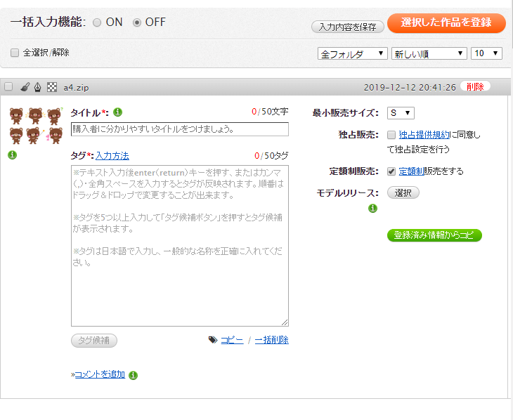 上記まで入力し終わったら、左上の端にあるチェックボタンにチェックを入れて「選択した作品を登録」ボタンを押して登録完了です!